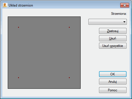 Jeżeli w trakcie definiowania użytkownik popełnił błąd (źle zdefiniowany został kształt strzemienia), to istnieje możliwość usunięcia takiego strzemienia; należy wybrać nazwę takiego strzemienia z listy rozwijanej strzemion i nacisnąć przycisk Usuń. Naciśnięcie przycisku Usuń wszystko spowoduje usunięcie wszystkich zdefiniowanych kształtów strzemienia.