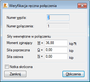 Naciśnięcie przycisku Obliczenia powoduje rozpoczęcie obliczeń wybranego typu połączenia dla danego węzła konstrukcji. Należy podać również siły wewnętrzne działające w połączeniu (N, Q, M).