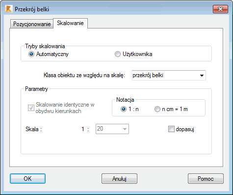 Pole Klasa obiektu ze względu na skalę umożliwia dostosowanie skali wybranego na rysunku obiektu (np. widoku elewacyjnego belki) do skali obiektu wybranego w tym polu (np. skali przekroju belki).