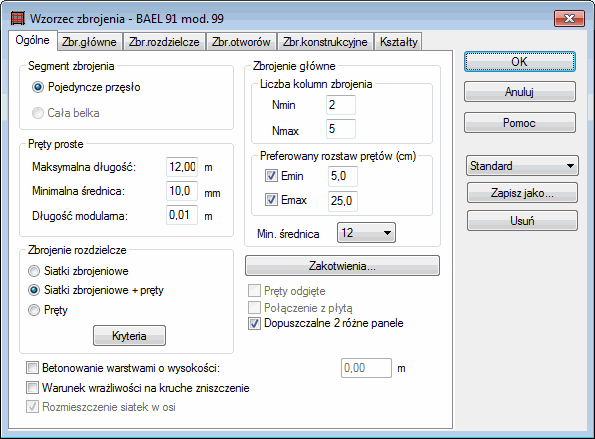 Dla zbrojenia rozdzielczego w postaci siatek lub siatek i prętów dostępny jest również przycisk Kryteria; jego naciśnięcie powoduje otwarcie dodatkowego okna dialogowego Kryteria.