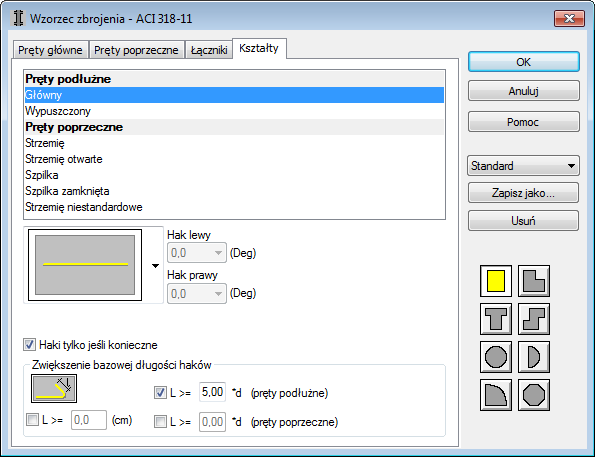 Karta Kształty służy do wyboru kształtu zbrojenia podłużnego i poprzecznego.