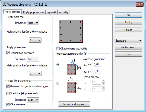 Opcja Generuj zbrojenie konstrukcyjne umożliwia generowanie prętów konstrukcyjnych (zamiast prętów głównych) wzdłuż boków przekroju, jeśli wymagają tego warunki rozstawu prętów. Należy jednak pamiętać, że pręty takie nie są uwzględniane w obliczeniach nośności przekroju.