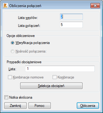 - Weryfikacja połączenia — jeżeli ta opcja zostanie wybrana, to po obliczeniach zostanie stwierdzone, czy zdefiniowane połączenie jest zgodne z wymogami wybranej normy.