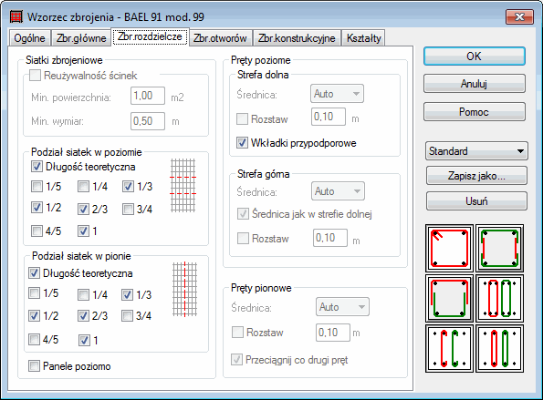 Po otwarciu okna dialogowego Wzorzec zbrojenia i wyborze karty Zbrojenie rozdzielcze na ekranie pojawia się pokazane poniżej okno.