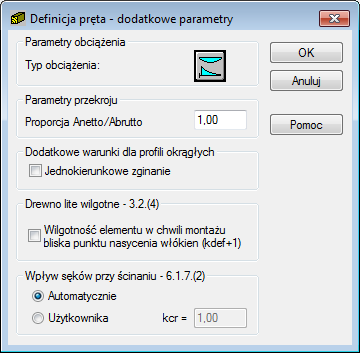 Opcja służy do określenia dodatkowych parametrów normowych typu pręta drewnianego. Jest ona dostępna po naciśnięciu przycisku Więcej znajdującego się w oknie dialogowym Definicja pręta — parametry.