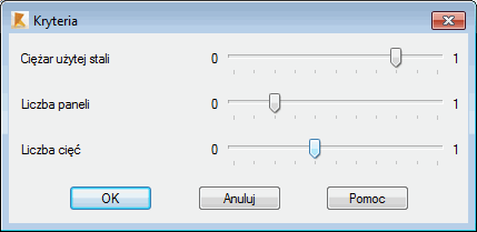 Dla każdej wymienionej powyżej opcji dostępny jest suwak pozwalający określić współczynnik ważności kryteriów optymalizacyjnych; współczynnik ten może przyjmować wartości z przedziału <0, 1>.