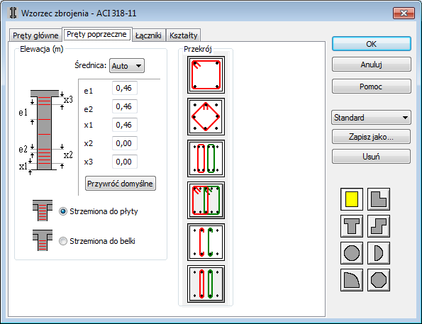 Zalecane parametry wzorców zbrojenia poprzecznego w przekroju. Lista wzorców odpowiada wybranemu kształtowi przekroju słupa. W zależności od wybranych wzorców i ich kolejności, program dobiera optymalne rozwiązanie.