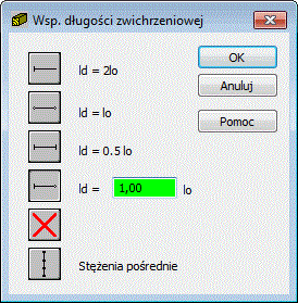 W powyższym oknie dialogowym znajdują się typowe sposoby zamocowań pręta, które warunkują odpowiednie wartości współczynników długości zwichrzeniowej. Ostatnia ikona i pola edycyjne służą do wprowadzenia współczynnika długości zwichrzeniowej przez użytkownika.