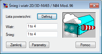 W oknie dialogowym należy określić listę powierzchni, na których generowane będą przypadki obciążenia klimatyczne. Naciśnięcie przycisku Definiuj powoduje otwarcie okna dialogowego Polilinia - kontur umożliwiającego definicję powierzchni obciążanych wiatrem i śniegiem. W polach Wiatr i Śnieg mogą zostać wybrane zdefiniowane przez użytkownika powierzchnie służące, odpowiednio, do generacji obciążeń śniegiem i wiatrem W szczególności należy określić bazowe ciśnienie wiatru i śniegu w zależności od położenia budynku.