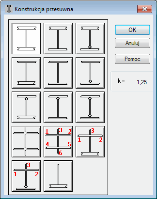 Okno dialogowe prezentowane na poniższym rysunku służy do wyboru schematu wyboczeniowego dla konstrukcji przesuwnej (takie samo okno dialogowe jest otwierane dla konstrukcji nieprzesuwnej). Otwierane jest po wybraniu opcji konstrukcja przesuwna (dla kierunku Y lub Z) w oknie dialogowym Wybór schematu wyboczeniowego słupa i naciśnięciu ikony symbolizującej schemat wyboczeniowy słupa.