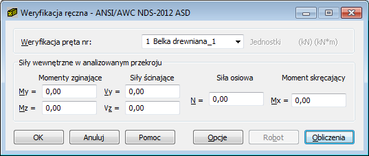 Okno to służy do weryfikacji pręta drewnianego dla wartości sił według wymogów normy dla drewna NDS 2012.