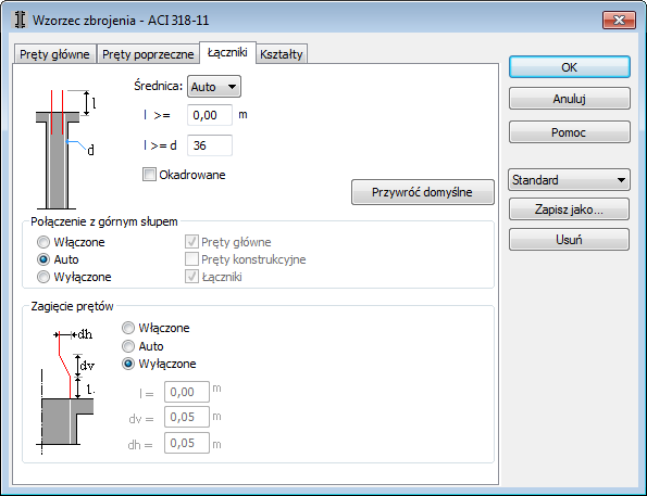 Wyłączone — nie zostanie wygenerowane zbrojenie łączące, nawet w przypadku gdy występuje słup górny.