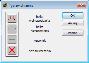 Opcja służy do określenia odpowiednich, normowych parametrów zwichrzeniowych w zależności od schematu statycznego pręta. Jest dostępna po naciśnięciu odpowiedniej ikony znajdującej się w polu Parametry zwichrzeniowe znajdującego się w oknie dialogowym Definicja pręta — parametry.