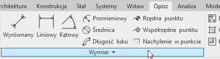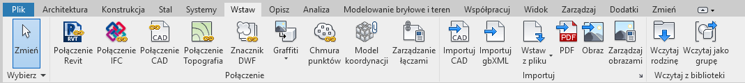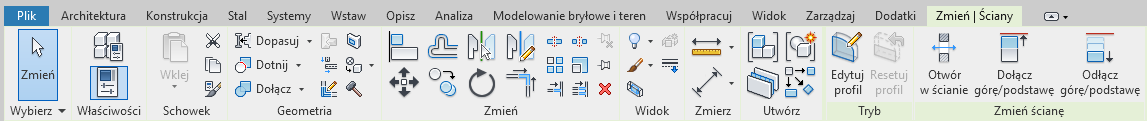 Wstążka jest wyświetlana podczas tworzenia lub otwierania pliku. Zawiera ona wszystkie narzędzia potrzebne do utworzenia projektu lub rodziny.