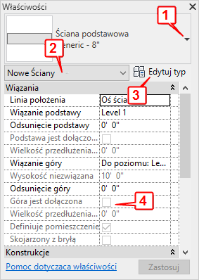 Najczęściej (zobacz uwagę o wyjątkach poniżej) na palecie Właściwości wyświetlane są zarówno właściwości elementów dostępne do edycji przez użytkowników, jak i właściwości tylko do odczytu (zacienione). Właściwość może być tylko do odczytu, ponieważ jej wartość jest obliczana lub przypisywana automatycznie przez program albo zależy od wartości innej właściwości. Na przykład właściwość ściany Wysokość niezwiązana można edytować tylko w sytuacji, gdy jej właściwość Więz góry ma wartość Niezwiązana. Szczegółowa lista zależności znajduje się w opisie właściwości wystąpienia danego typu elementów.