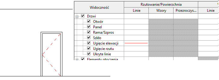 Podkategorii stylu obiektu można użyć do kontroli widoczności i grafiki części rodziny w kategorii. Przykładowo podkategoria kontroluje widoczność otwierania drzwi w widoku elewacji. Na poniższej ilustracji podkategoria Ugięcie elewacji jest zastępowane w celu użycia czerwonej linii.