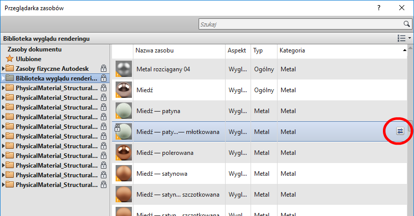 Istniejący zasób można zastąpić innym, wybranym z Przeglądarki zasobów. Materiał przyjmie właściwości nowego zasobu.