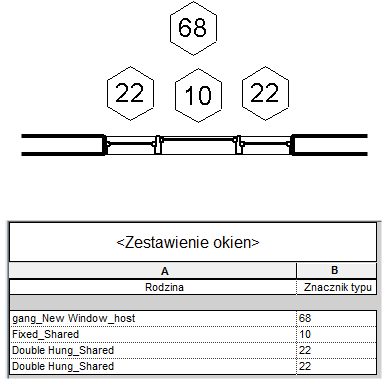Aby umożliwić oznaczenie i utworzenie zestawienia zarówno okna nieotwieralnego, jak i podwójnego okna oklejonego drewnem, została utworzona taka sama rodzina okien potrójnych, lecz tym razem nowa rodzina okien jest używana jako rodzina nadrzędna, a okno nieotwieralne i okna oklejone drewnem są wczytane jako rodziny współdzielone. Zauważ różnice w paramatryzowaniu i zestawianiu.