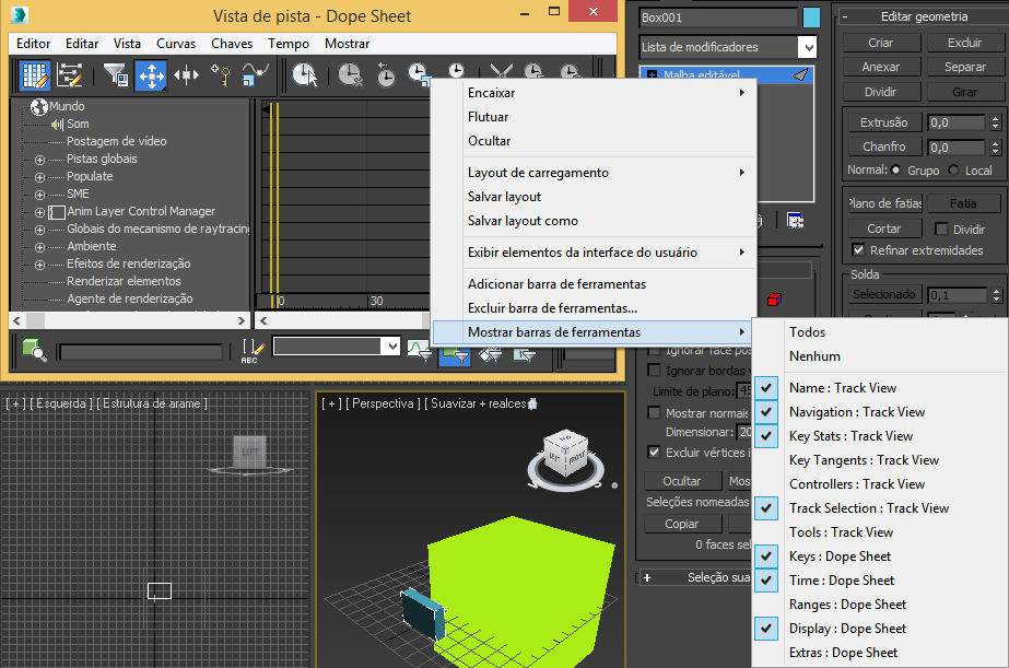 Faixas: Dope Sheet. O 3ds Max abre a barra de ferramentas Faixas.