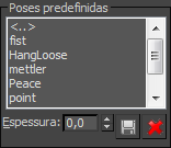 A lista de Poses predefinidas mantém as poses dos dedos. Uma pose do dedo compreende as rotações de todos os ossos do dedo da palma ou do tornozelo. Com os controles deste grupo é possível salvar as predefinições de poses e carregá-las para qualquer outra palma.