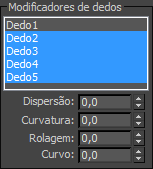 O grupo Modificadores de dedos fornece ferramentas para permitir que você manipule os dedos um a um ou em grupo. Você pode transformar os dedos selecionados de forma paramétrica com os controles Dispersão, Curvatura, Rolagem e Curva.