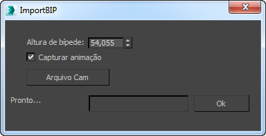 Não há configurações para a importação de arquivos BIP. Quando seleciona o arquivo BIP, a caixa de diálogo Capturar animação abre-se imediatamente.