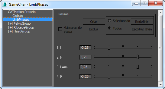 O painel LimbPhases oferece as configurações globais para o movimento dos braços e das pernas no CATMotion.
