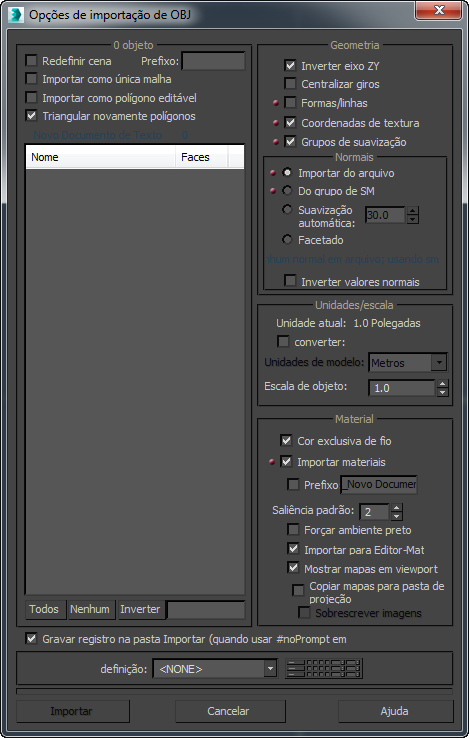 Logo acima da lista de objetos no arquivo, mostrados como campos somente leitura, estão o nome do arquivo OBJ e o número total de faces no arquivo.