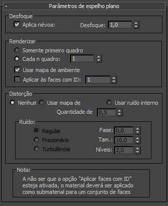 É possível atribuir um material de espelho plano a um objeto sem ter que torná-lo um componente de um material demultiobjeto/subobjeto. A restrição é que as outras faces do objeto devem poder usar as propriedades não espelhadas do mesmo material (sua cor difusa e assim por diante). Se a outras faces precisarem de características de material completamente diferentes, você precisará usar um material de multiobjeto/subobjeto.