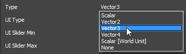 nó de Variável de material e selecione Escalar, Vetor 3 ou Vetor 4 na lista suspensa Tipo no painel Propriedades.