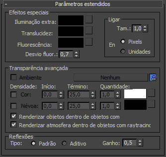 A implementação Parâmetros estendidos para um Material Raytrace controla os efeitos especiais, as propriedades de transparência e a refletividade avançada do material.