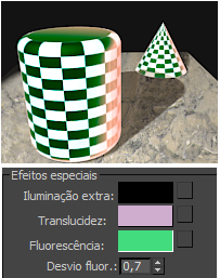 Em 0,5, o Desvio faz com que Fluorescência se comporte da mesma forma que a coloração difusa. Os valores de Desvio maiores do que 0,5 aumentam o efeito de fluorescência, tornando o objeto mais brilhante do que os outros objetos da cena. Os valores de Desvio menores do que 0,5 tornam o objeto mais turvo do que os outros objetos da cena. É possível obter alguns efeitos de transformação cromática com isso.