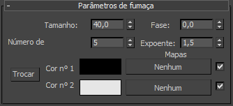 Fumaça é um mapa 3D que gera padrões amorfos e turbulentos baseados em fractal. Foi primariamente concebido para mapas Opacidade animados para estimular os efeitos da fumaça em um feixe de luz ou outros efeitos nebulosos fluentes.