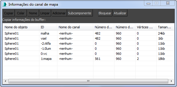 A caixa de diálogo Informações do canal de mapa do utilitário mostra todos os dados do canal dos objetos selecionados. Exibe o número de canais, o número de vértices por canal e a quantidade de memória utilizada pelo canal. Também permite que você nomeie canais, além de limpar (ou excluir), copiar e colar canais. Cada uma destas ações, exceto renomear, coloca um modificador na pilha para obter os resultados.