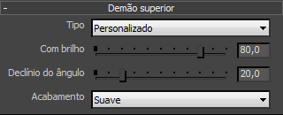 O brilho em um valor de 0.0, o acabamento da superfície é completamente opaco. Glosiness em um valor de 100.0, o acabamento da superfície é completamente reflexivo.