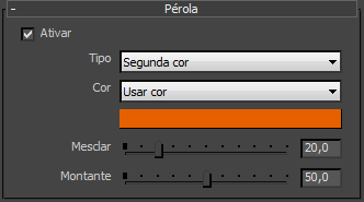 Quando a segunda cor está ativa, você pode escolher uma cor complementar para o efeito pérola e ajustar mescla, que vai de 0.0 a 100,0 (padrão=20.0), onde 0.0 exibe somente a cor base e a 100.0 somente exibe esta cor complementar. Com uma segunda cor, também é possível ajustar a quantidade.