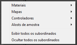 A primeira seção de menu é um atalho no navegador. A escolha de um material ou mapa a partir do menu coloca um nó para o material ou mapa na vista ativa.