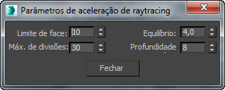 Os controles desta caixa de diálogo permitem substituir o valor padrão de aceleração e especificar seus próprios requisitos. Normalmente, não é necessário usá-los, mas, se você conhece os requisitos de sua cena, eles podem ajudá-lo a otimizar a renderização do tracejamento do raio para suas necessidades específicas e restrições de tempo.
