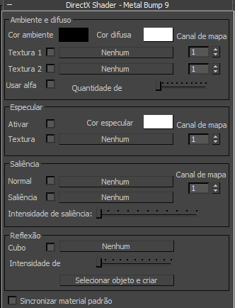 Nota: Para poder utilizar o sombreador Metal Bump9, você deve ter o 3ds Max configurado para utilizar o driver de gráficos Direct3D. Para alterar a configuração do driver gráfico, consulte o tópico