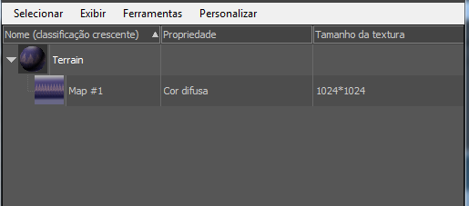 Como o painel Cena superior, a parte inferior principal do painel Material inferior é uma janela com colunas que descrevem as propriedades do mapa e do material. O Material Explorer permite editar algumas propriedades nessas colunas. As colunas no painel Material diferem daquelas no painel Cena.