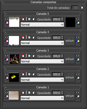 Os controles de um mapa Composto incluem a lista dos mapas que ele combina com um modo de mesclagem, configuração de opacidade e máscara para cada um.