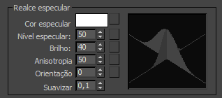 Os controles desse grupo afetam a aparência dos realces especulares. Realces especulares simulam a superfície do objeto com tracejamento de raio que reflete luzes na cena. A alteração de cor ou da intensidade das luzes na cena pode alterar a aparência dos realces especulares.
