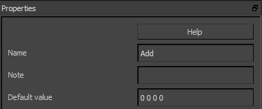 No editor ShaderFX do seu gráfico Interactive, crie um nó, por exemplo, Adicionar. Clique em qualquer atributo de entrada no nó para exibir suas configurações no painel Propriedades. Um valor padrão foi atribuído ao nó; neste caso, 0 0 0 0 (um valor float4).
