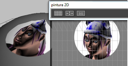 A imagem, aplicada diretamente à superfície da esfera perto da parte superior (esquerda), aparece distorcida na janela Pintura 2D.