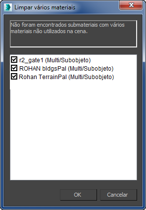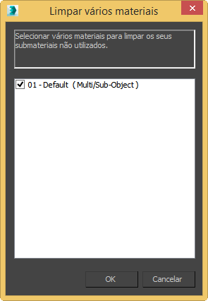 A caixa de diálogo Limpar apresenta uma lista de todos os materiais Multiobjeto/subobjeto que, na cena, contêm materiais não atribuídos. Você pode selecionar os materiais dos quais deseja remover materiais não atribuídos.