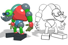 Como o Ink n Paint é um material, é possível criar uma cena que combina objetos sombreados em 3D com objetos de desenhos com aplicação de poucas cores.