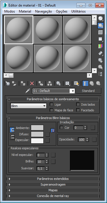 A interface do Editor de Material é composta de uma barra de menus na parte superior, ranhuras de amostra (as esferas) abaixo da barra de menus e as barras de ferramentas ao longo da parte inferior e na lateral das ranhuras de amostra.