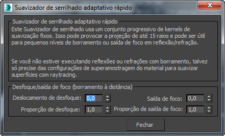 A caixa de diálogo Suavizador de serrilhado adaptável rápido altera as configurações para o material de Tracejamento de raios e mapeia o suavizador de serrilhado adaptável rápido. É possível utilizar essa caixa de diálogo tanto de forma global, na implementação de Parâmetros globais do Raytracer, ou de forma local, da implementação Controles do Raytracer. Quando você alterar localmente as configurações para um suavizador de serrilhado, não afetará as configurações globais do suavizador de serrilhado.