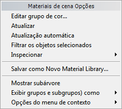 As hipóteses neste submenu especificam quais as áreas do 3ds Max a inspecionar ao atualizar a lista de materiais/mapas do grupo de Materiais da cena. As três escolhas são ativadas por predefinição: