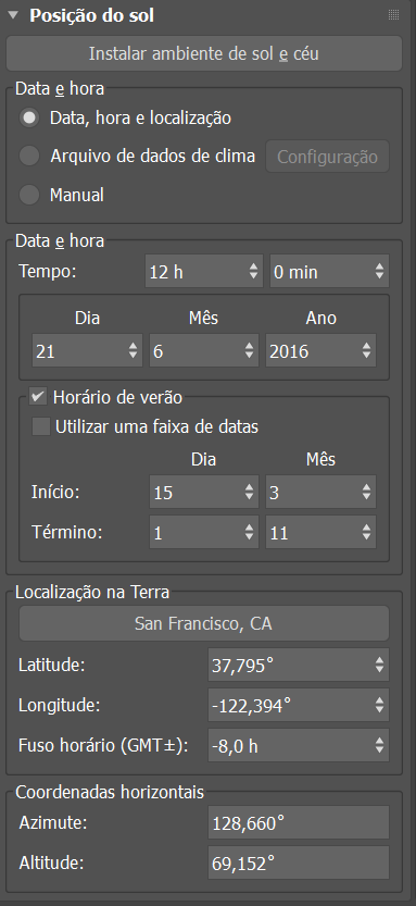 - Posicione o sol manualmente por meio da translação/rotação ou altitude/azimute.